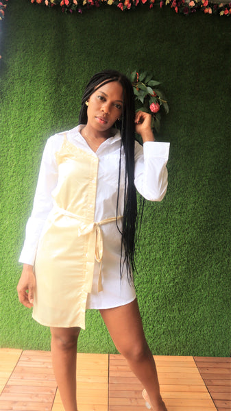 White and champagne spliced   shirt dress