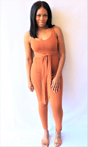 Rust tie front jumpsuit, super comfy fit with zipper at the back.